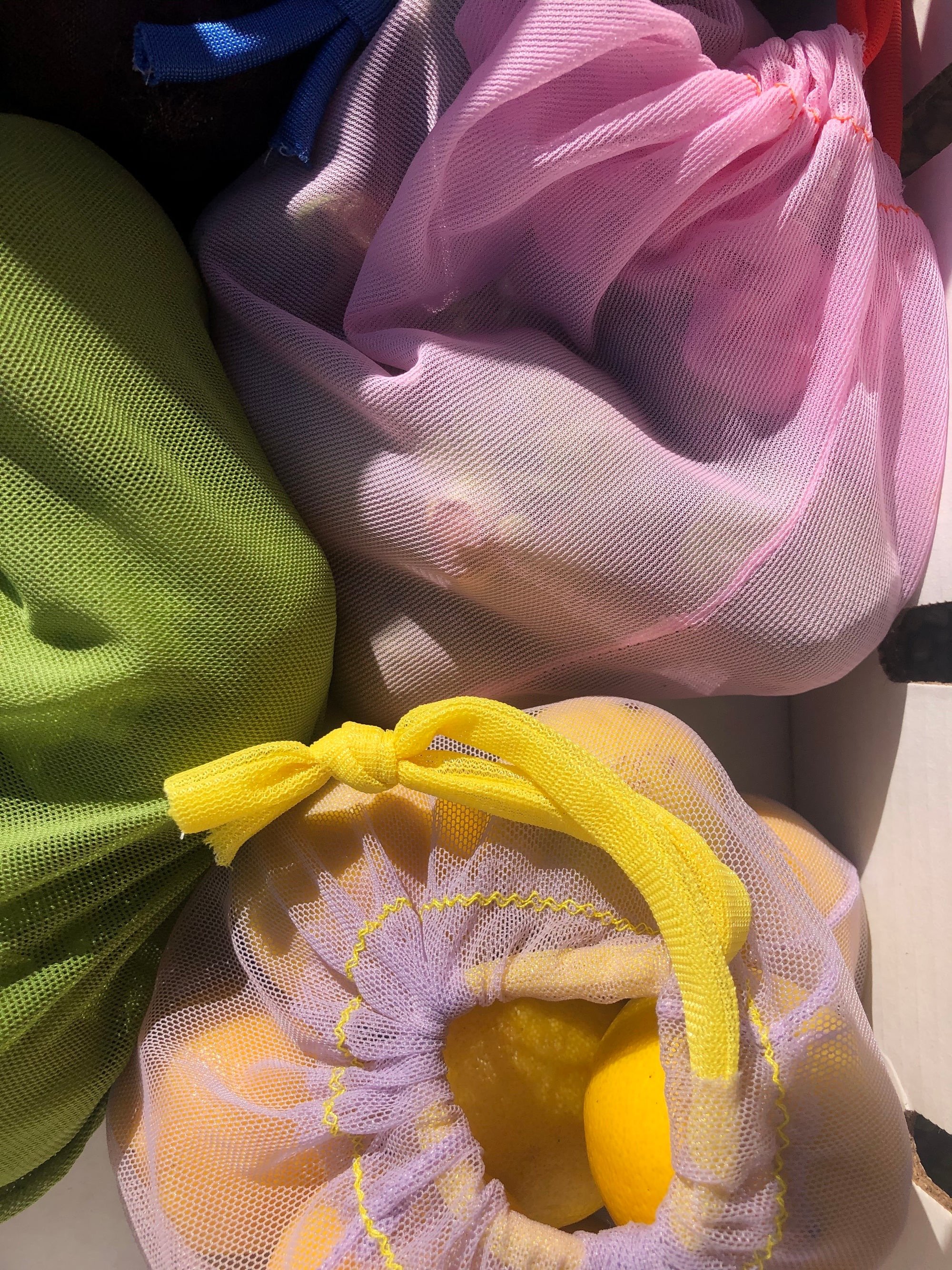 3x Produce bags made in vibrant mesh with drawstring ties. Fabrics and colour combos vary per set.
