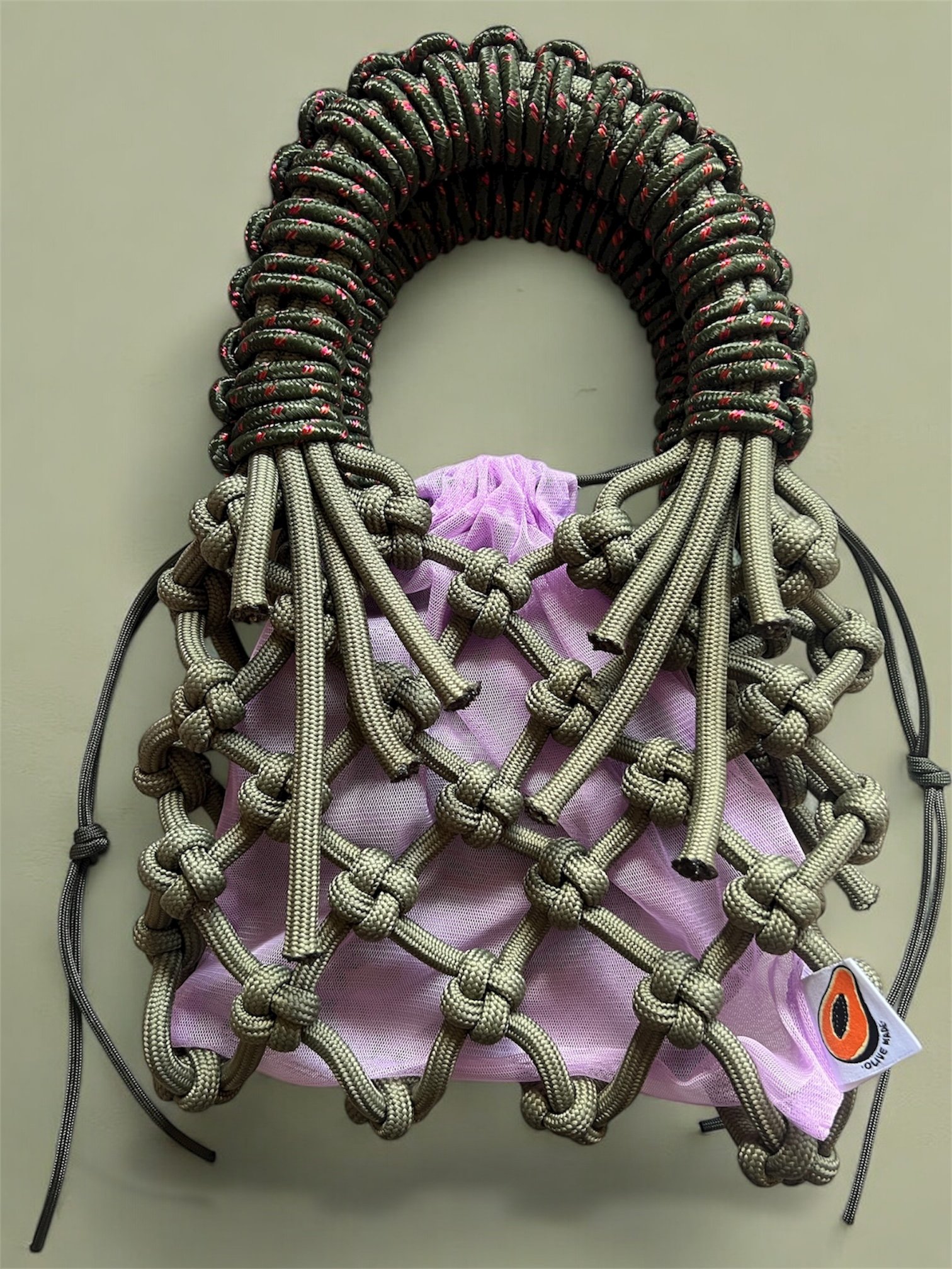 Green macrame rope bag with green handle (with red/pink flecks) and a purple drawstring pouch